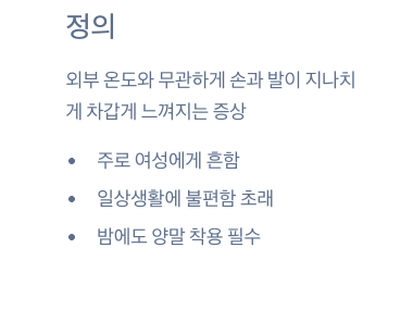 - 수족냉증: 체온은 정상이나 손발만 차가움