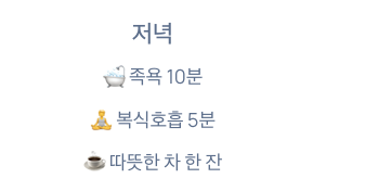 | 저녁 | 족욕 10분 + 복식호흡 + 따뜻한 차 |