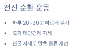- 걷기, 자전거, 요가 등의 저강도 유산소 운동은 혈액순환을 촉진합니다.