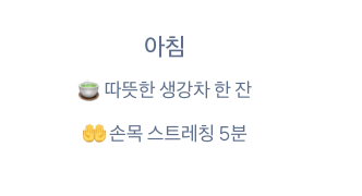 | 아침 | 따뜻한 생강차 한 잔 + 손목 스트레칭 |