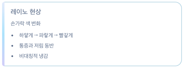 - 손가락이 하얗게 → 파랗게 → 빨갛게 변하는 색 변화