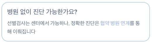 A. 선별검사는 센터에서 가능하지만, 정확한 진단은 협약 병원 연계를 통해 이뤄집니다.