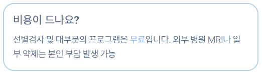 A. 선별검사 및 대부분의 프로그램은 무료입니다. 단, 외부 연계 병원에서의 MRI나 일부 약제는 본인 부담이 발생할 수 있습니다.