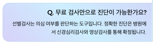 A. 선별검사는 의심 여부를 판단하는 도구이며, 정확한 진단은 병원에서 신경심리검사와 영상검사를 통해 확정됩니다.