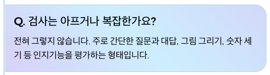 A. 전혀 그렇지 않습니다. 주로 간단한 질문과 대답, 그림 그리기, 숫자 세기 등 인지기능을 평가하는 형태입니다.