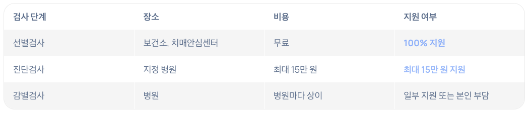 | 선별검사 | 보건소, 치매안심센터 | 무료 | 100% 지원 |