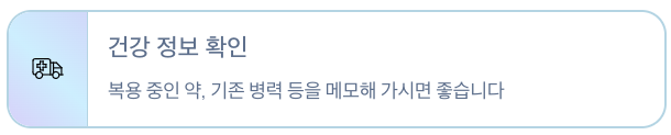 - 기본 건강 정보 확인(복용 중인 약, 병력 등)