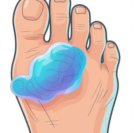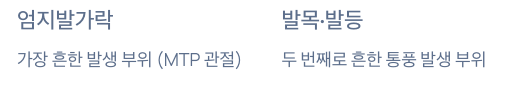 가장 흔한 부위는 엄지발가락(MTP 관절)입니다.