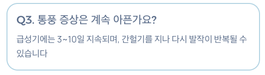 - 첫 24시간 동안 통증이 절정에 다다르며, 3~10일 후 자연히 가라앉는 경우도 있음
