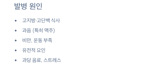- 고지방 고단백 식사, 과음, 비만, 운동 부족, 유전적 요인 등이 복합적으로 작용
