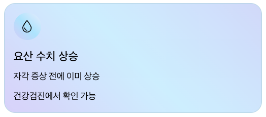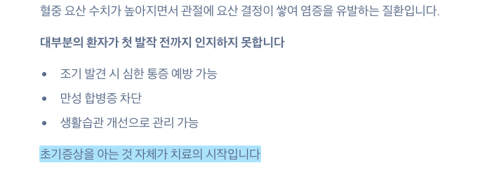 - 자각 증상이 나타나기 전에 이미 요산 수치가 기준치 이상으로 상승해 있을 수 있습니다.