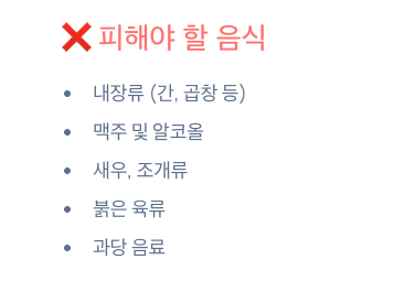 - 피해야 할 음식: 내장류, 맥주, 새우, 조개, 육류, 과당 음료