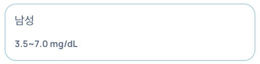 - 정상 수치: 남성 3.5~7.0 mg/dL, 여성 2.5~6.0 mg/dL