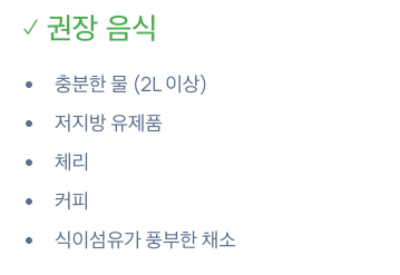 - 권장 음식: 물, 저지방 유제품, 체리, 커피, 식이섬유