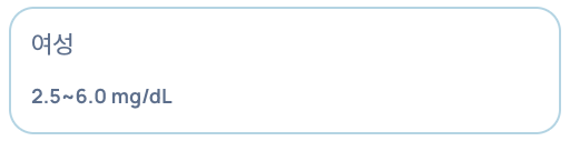 - 정상 수치: 남성 3.5~7.0 mg/dL, 여성 2.5~6.0 mg/dL