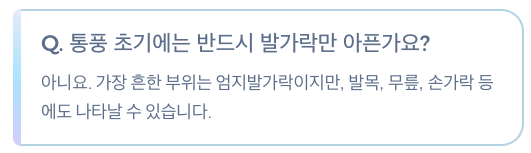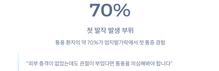💡 통풍 환자의 약 70%가 첫 통풍 발작을 엄지발가락에서 경험합니다.