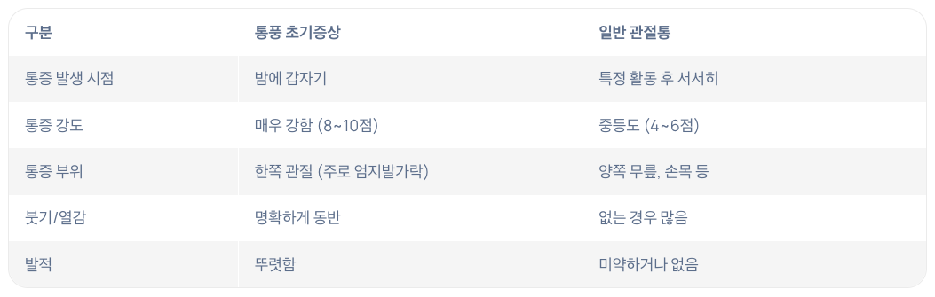 ✅ 이런 차이를 통해 단순한 관절통과 통풍 초기증상을 구별할 수 있습니다.