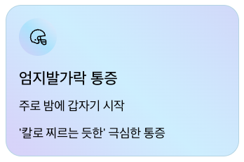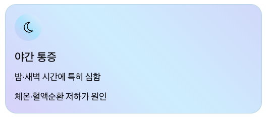 | 통증 발생 시점 | 밤에 갑자기 | 특정 활동 후 서서히 |