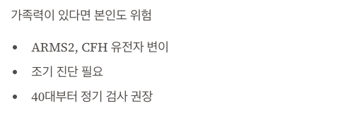 • 이상 증상(휘는 선, 흐린 중심 시야 등)이 느껴지면 즉시 검진받으세요.