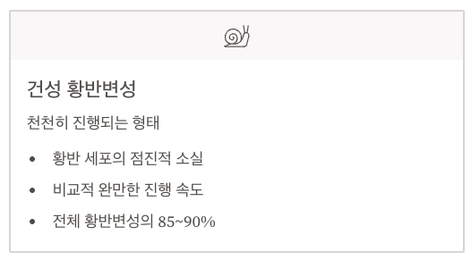 - 건성 황반변성은 비교적 천천히 진행되며, 황반의 세포가 점차 소실됩니다.
