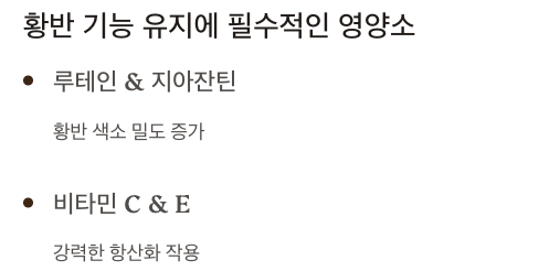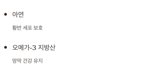 - 루테인, 지아잔틴, 비타민 C/E, 아연은 황반 기능 유지에 매우 중요합니다.