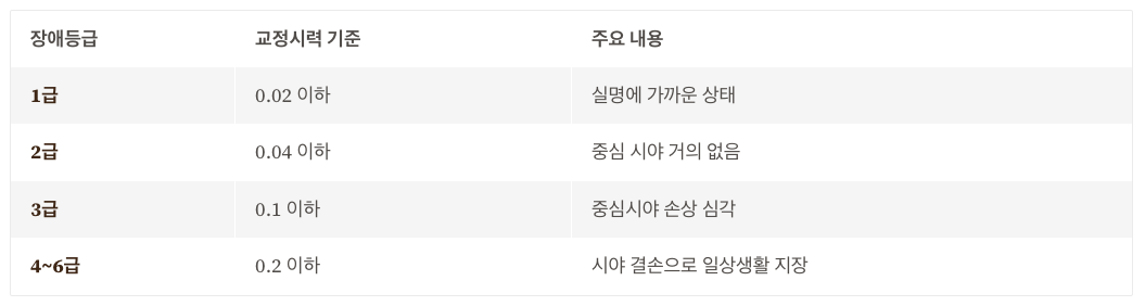 | 장애등급 | 시력 기준(양안 교정시력) | 주요 내용 |