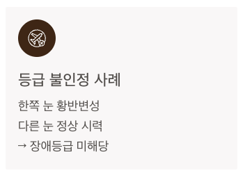 - ❌ 예시 3: 한쪽 눈 황반변성, 다른 눈 정상 시력 → 장애등급 미해당