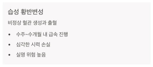 - 습성 황반변성은 비정상적인 혈관(맥락막신생혈관)이 생성되어 출혈과 삼출물이 발생하며 급격한 시력 저하를 일으킵니다.